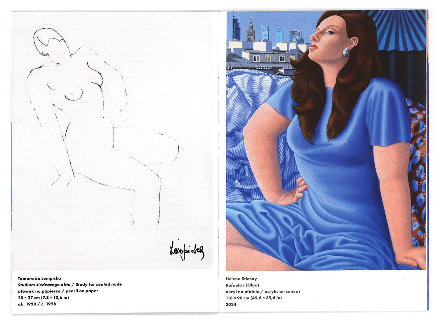 Rafaela I (Olga) is a work in which Stiasny most openly refers to Łempicka’s painting, but it also contains references to socialist representations of women, where strength was primarily physical. In Stiasny’s work, self-assurance built through posture is only part of the story: Olga’s navy-blue pleated gown in the background reveals her profession. Among the four paintings, this is the only one where the model is not nude but poses in a blue dress featured in the exhibition’s title. Stiasny does not pressure her models to pose nude—part of her feminist practice is to pay special attention to the needs and boundaries of the models.