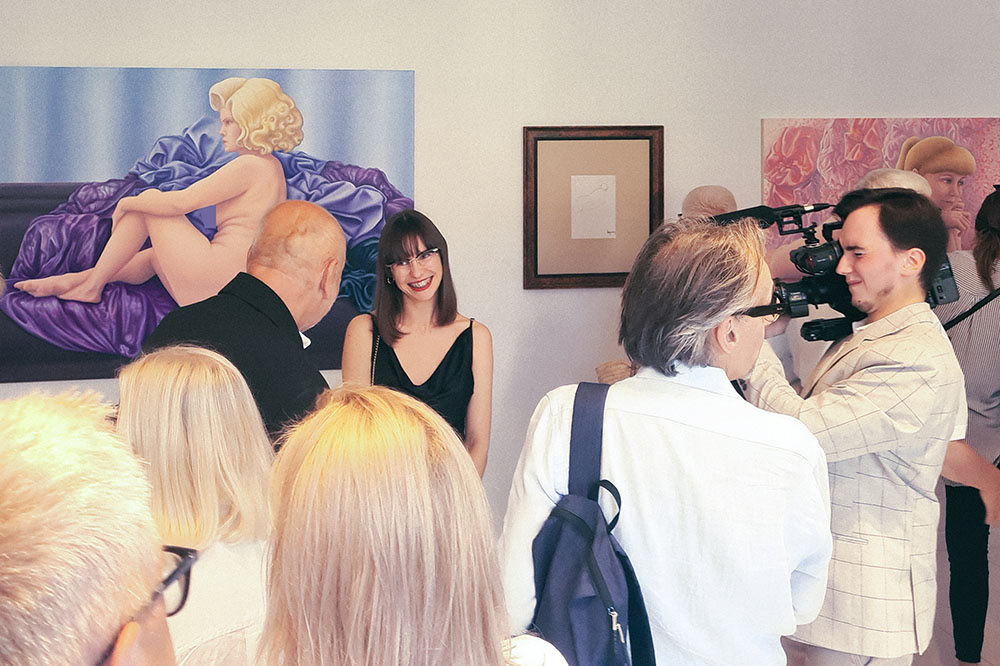 The same model appears in two of the four presented works by Helena Stiasny: a blonde with her hair tied up in a high ponytail. It is difficult to guess her age; girlishness here clashes with femininity. In one painting, the model sits astride the edge of a bathtub, gazing at the viewer; in another, she lies on a pink plush carpet.