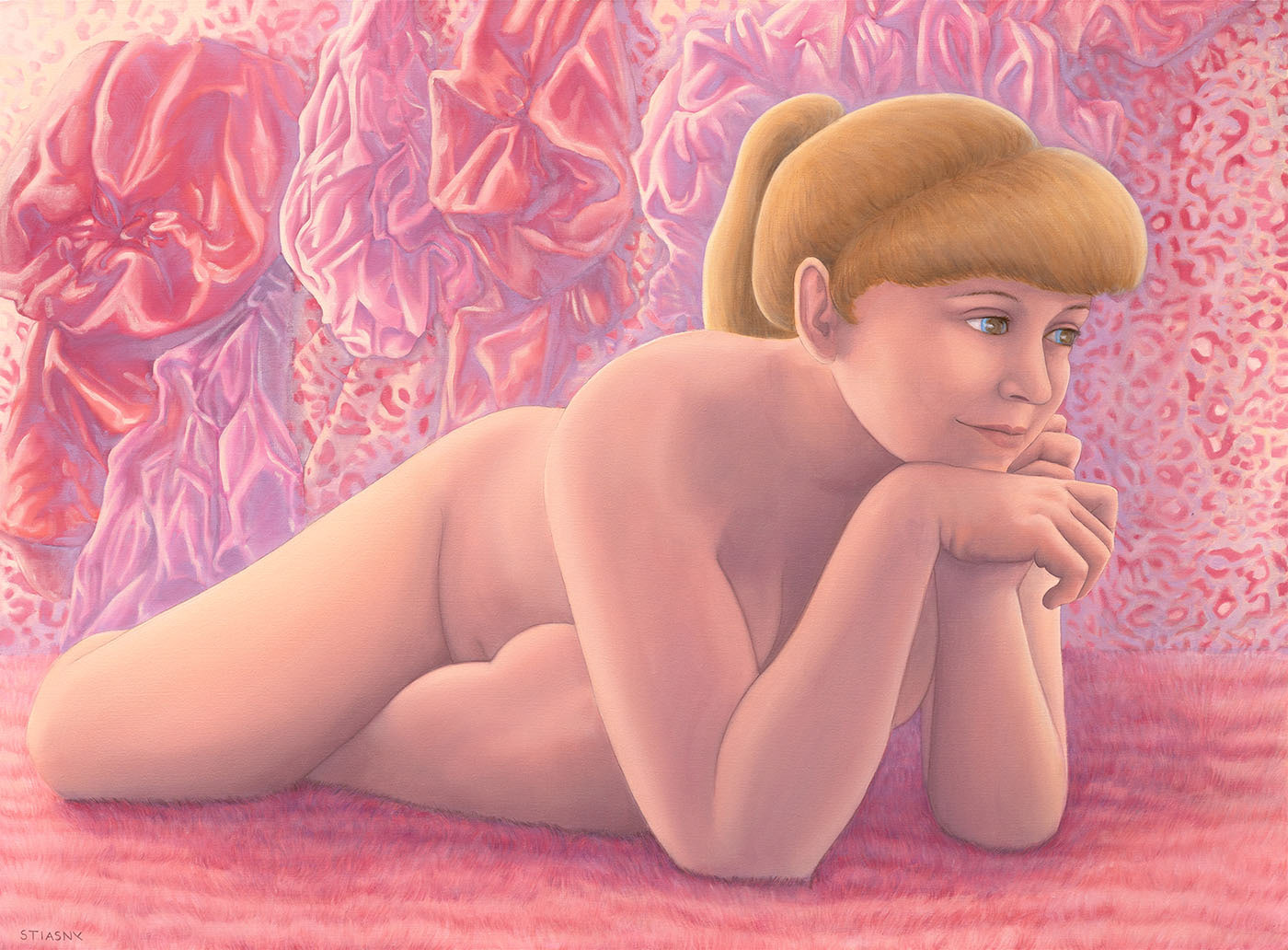 The image of a young woman in public space is still most often constructed through objectification and sexualization, sometimes less frequently through squeezing girlish bodies into the category of cute; occasionally these two approaches combine. In Stiasny’s paintings, the nude girl is not depicted as a sexual object, yet there is still a temptation to see her as cute: in the work Rafaela IV (Asia) the softness of the fluffy pink carpet and the fabrics in the background seem to correspond with the delicacy of the model’s body.