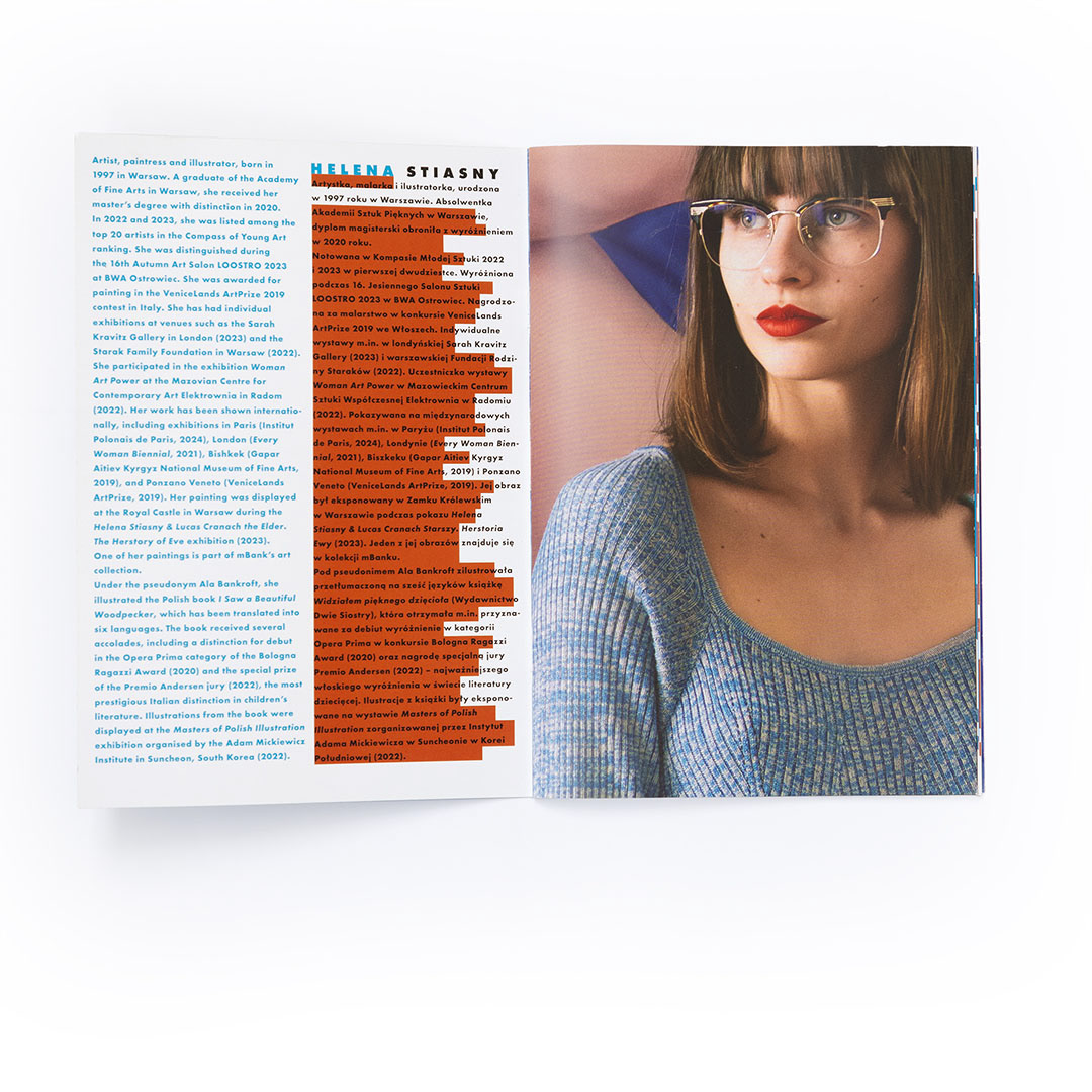 The works of Helena Stiasny are based on tensions: between the softness of fabrics and textiles and the cold gaze of the model, between the smile of a young girl and her forced, unnatural pose. Carnality here is not an end in itself but a means to anchor these tensions in the material world. Stiasny paints women who are close to her: a friend shortly after giving birth, a lawyer-friend, a drag queen. In her paintings, there is a need to break away from the internalized male view - easily found in Łempicka, with whom Stiasny enters into dialogue - and to present models from a feminist perspective, with tenderness yet free from the infantilization of femininity.
