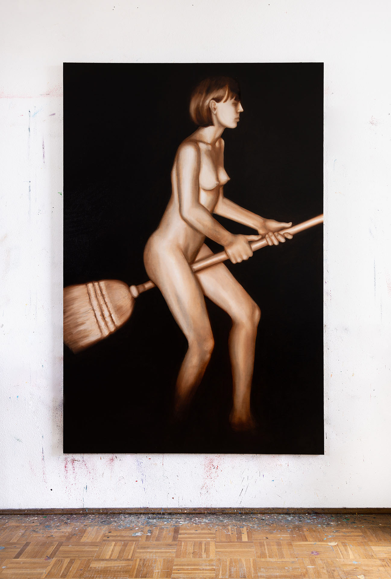 Na miotle / On a Broomstick, technika mieszana na płótnie, 180 x 120 cm, 2023, widok z pracowni, Warszawa
